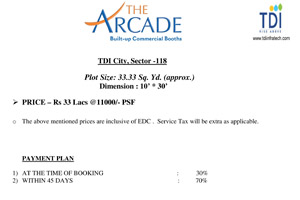 The Arcade offers exclusively designed commercial booths that are best suited for small businesses, fashion retail stores, restaurants, salons, pharmacies, and other retail service stores. As an integrated feature of the 300 acre (approx) TDI City, these units are elegantly designed to offer the finest platform for target customers for a wide range of retail businesses. Ideally located just a few meters from the national highway (NH 21), The Arcade delivers to meet the growing needs of both retailers and customers in the area, while providing the facilities that would ensure the success of any retail business that is established within these self contained units.